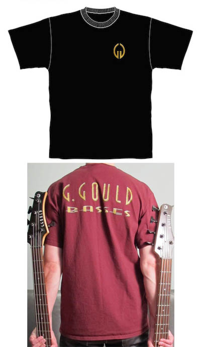 This shirt features a beveled, multi-color screen print of the logo on the front, and "G. Gould Basses" on the back. The image on the left shows the black shirt on top, and the maroon version on the bottom. From time to time we may have different colors available on a limited basis.