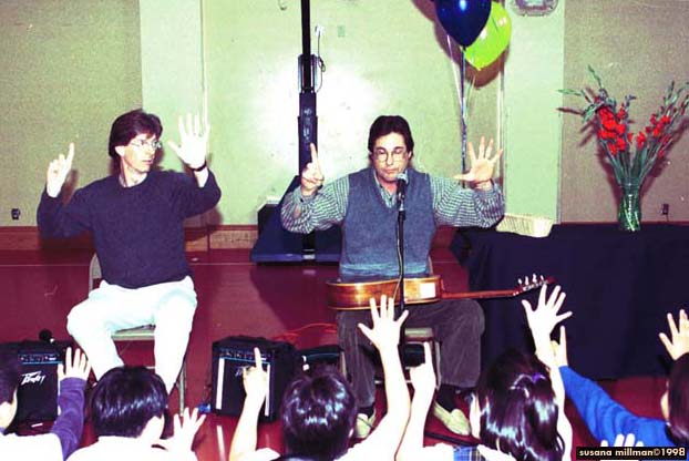 Phil Lesh and Tim Kane, playing for the kids at the Tenderloin recereation center where the donations from Philharmonia were given.