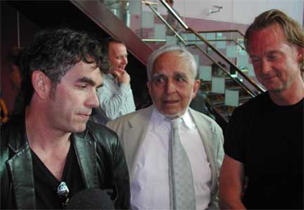 Next up after Bill was legendary engineer Eddie Kramer. Being a sound guy, he's looking down at my DAT machine, jokingly helping me get my audio levels while I take a picture of the top of his head! Next up was the movie's director, Bob Smeaton. While a young man, Bob has picked up quite a resume, a two-time Grammy award-winning director of "The Beatles Anthology," and "Hendrix: Band of Gypsies." Next up, came the producers. Left-to-right, we see Gavin Poolman (son of FESTIVAL EXPRESS original producer, Willem Poolman,) Willem, and John Trapman. Bob Weir and his wife arrived, and Bob was nattily dressed in a suit and tie. Always one with a good story, I had managed to get the DAT machine working by this time, and you can download the MP3 interview here. The initial upload here is in stereo, and you can hear all the hustle and bustle in the lobby, as well as the busses going by.